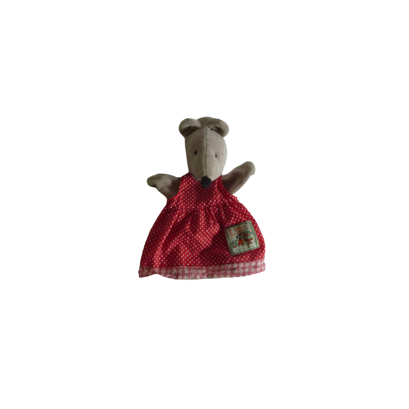 Doudou marionnette souris 25 cm environ, robe rouge à pois. Etat :Très bon état