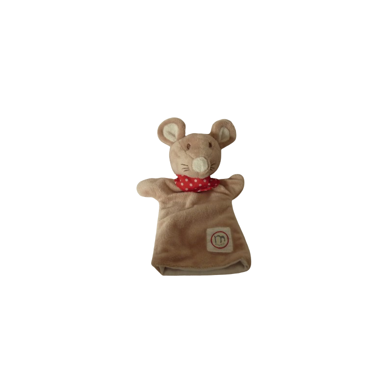 Doudou marionnette souris marron 27 cm environ, bandana rouge à pois écusson Mouse. Etat : Excellent étatDestinataire :