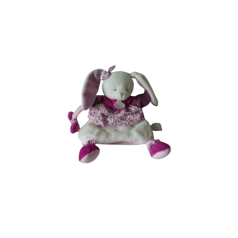Doudou marionnette lapin 29 cm environ sans compter les oreilles, blanc fuhchia mauve tissu fleuri. Etat : Comme neufDestinataire :