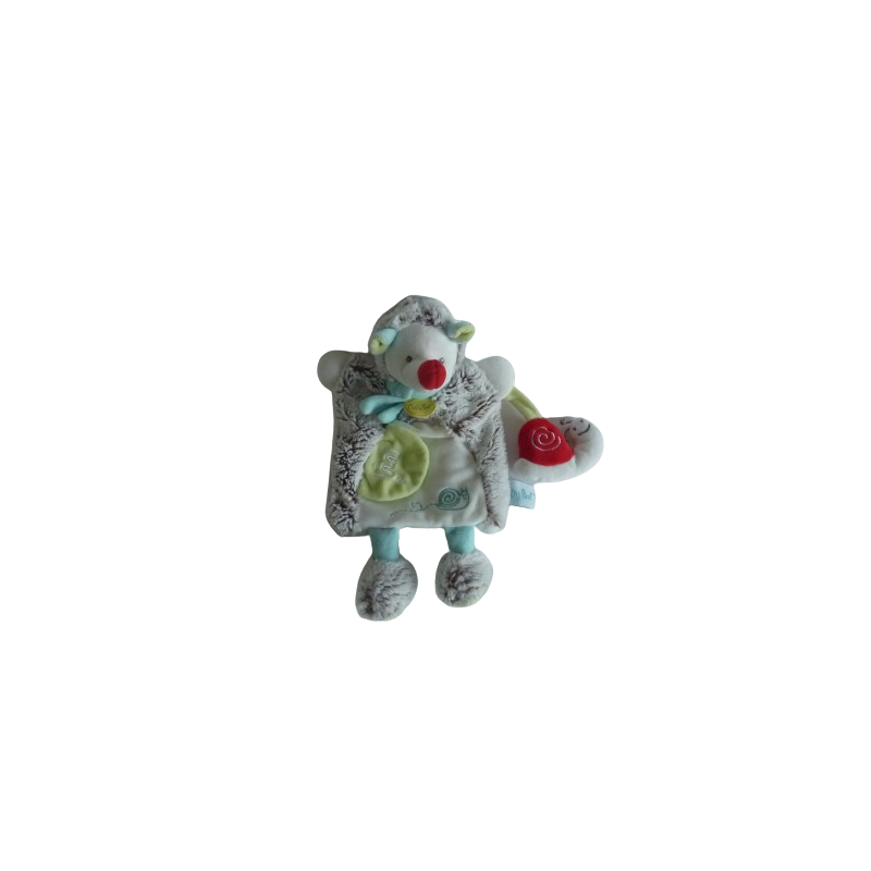 Doudou marionnette hérisson 31 cm environ, gris chiné blanc vert turquoise, tient un petit escargot blanc rouge. Etat : Comme neufDestinataire :