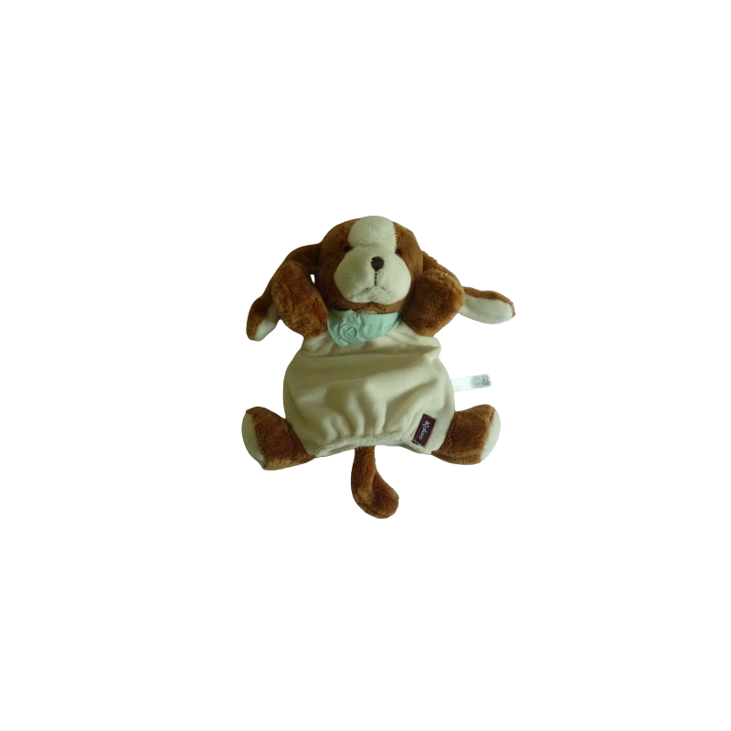 Doudou marionnette chien 26 cm environ, écru marron écharpe turquoise. Etat : Comme neuf
