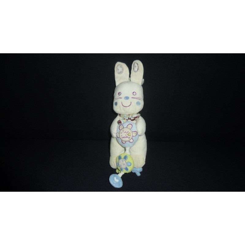 Description du doudou : Doudou 25 cm environ (oreilles comprises), musical. Doudou super doux. Etat : Occasion en bon état (attache par velcro ne tient plus, de légères marques d'usures, tissu sous les pieds bouloché), la musique fonctionne parfaitement bien. DOUDOU DIFFICILE A TROUVER