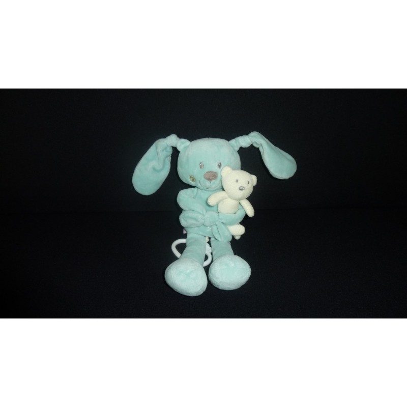 Description du doudou : Doudou musical lapin de 28 cm environ (sans les oreilles), tient un petit ours, musical. Doudou super doux. Etat : Neuf, sans étiquette boutique. Produit original.Destinataire :