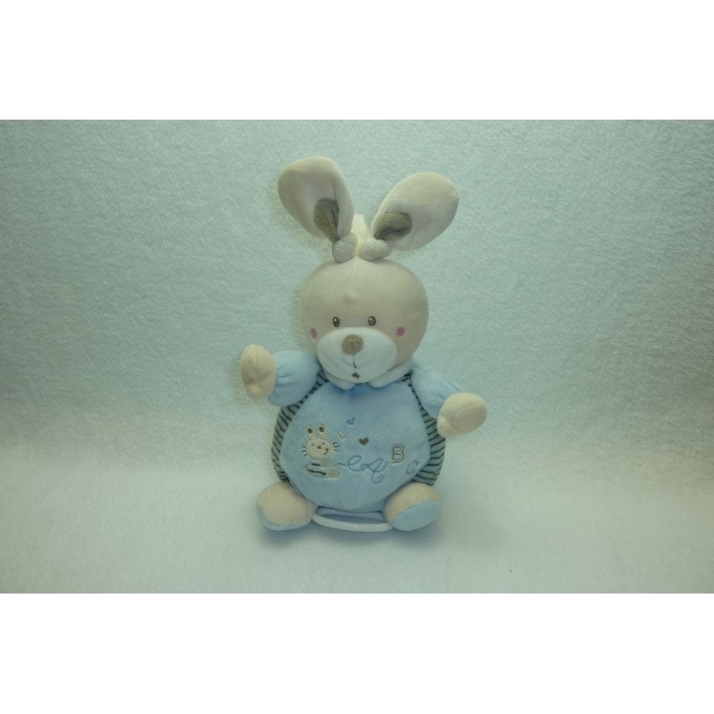 Description du doudou : Doudou musical lapin de 22 cm environ sans les oreilles. Coloris : bleu, beige, motifs : ABC lapin. Etat : Comme neuf (étiquette de la marque coupée). Produit original. DOUDOU DIFFICILE A TROUVER