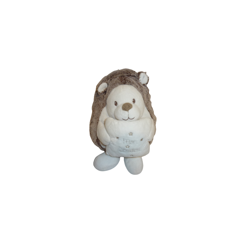 Doudou musical hérisson 23 cm environ, marron blanc. Etat : très bon état (mais musique fonctionne parfois au ralenti). DOUDOU DIFFICILE A TROUVER.Destinataire :