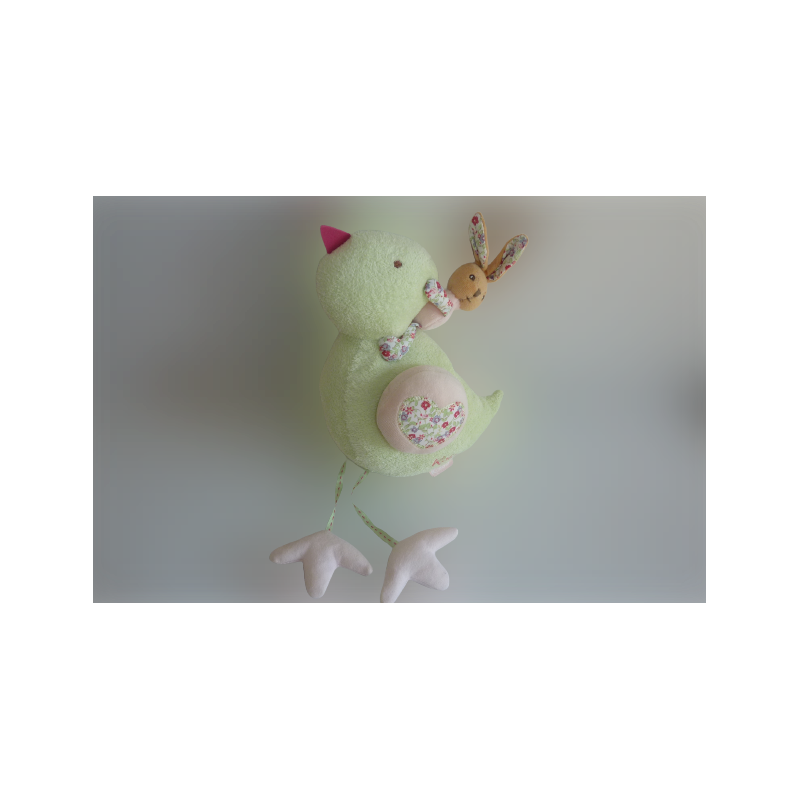 Doudou peluche musicale poule 25 cm environ de large, porte sur son dos un lapin, vert fleuri rose. Etat : Excellent état. DOUDOU DIFFICILE A TROUVERDestinataire :