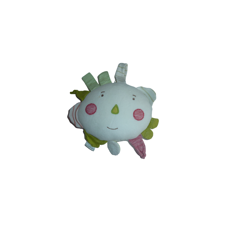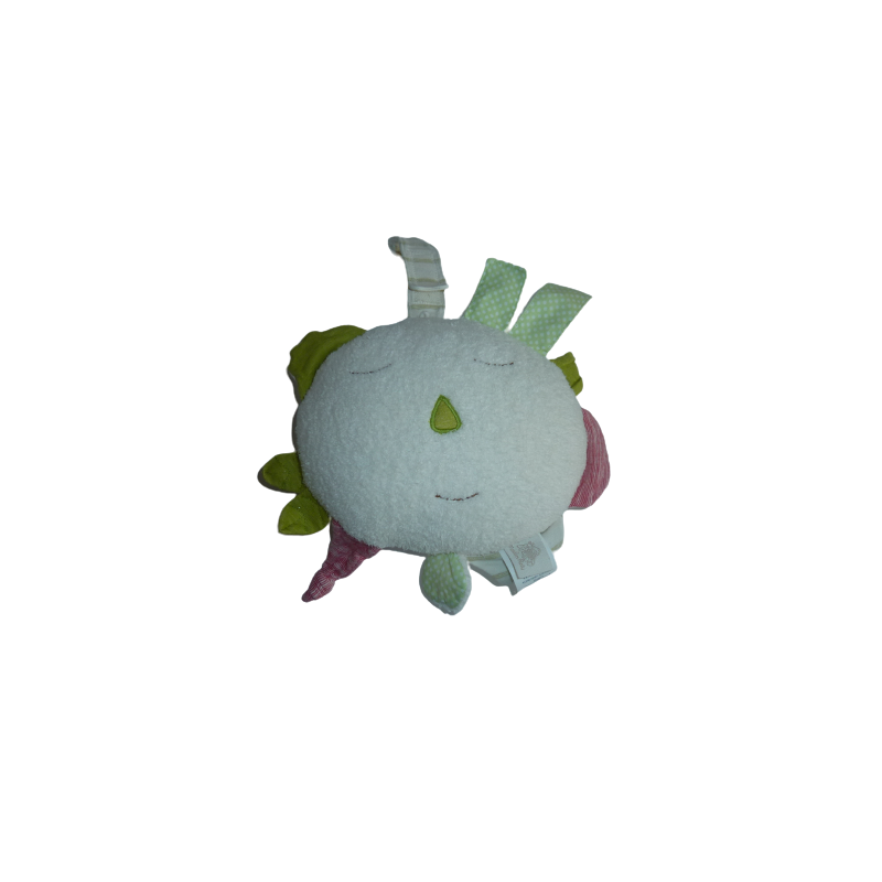 Doudou musical soleil 25 cm environ de large, matière bruissante, une face éveillée et une face dormeur. Etat : Très bon état (mais petites taches sur la face dormeur). DOUDOU DIFFICILE A TROUVER