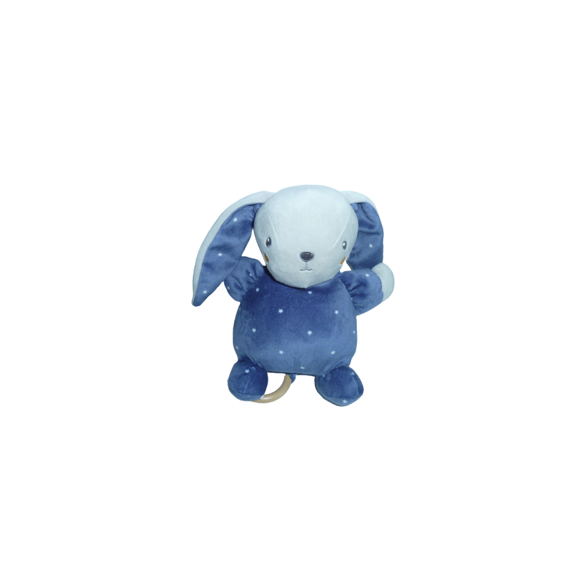 Doudou peluche musicale lapin 21 cm environ sans les oreilles, bleu gris motif étoiles. Etat : Neuf sans étiquette boutique. DOUDOU DIFFICILE A TROUVER