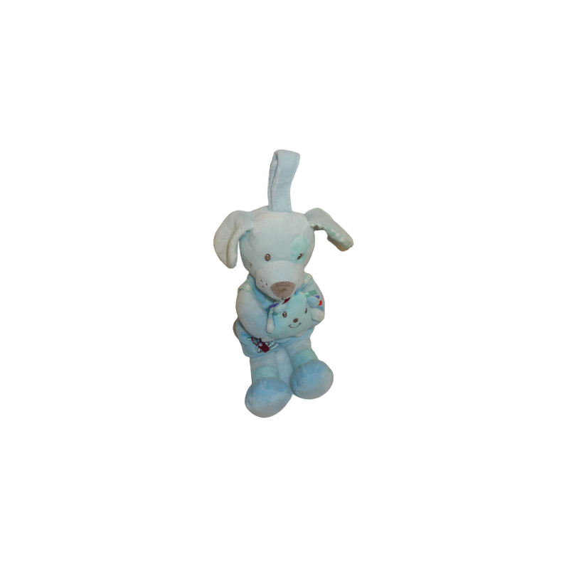 Doudou peluche musicale 28 cm environ, bleu motifs. Etat : Très bon état. DOUDOU DIFFICILE A TROUVER