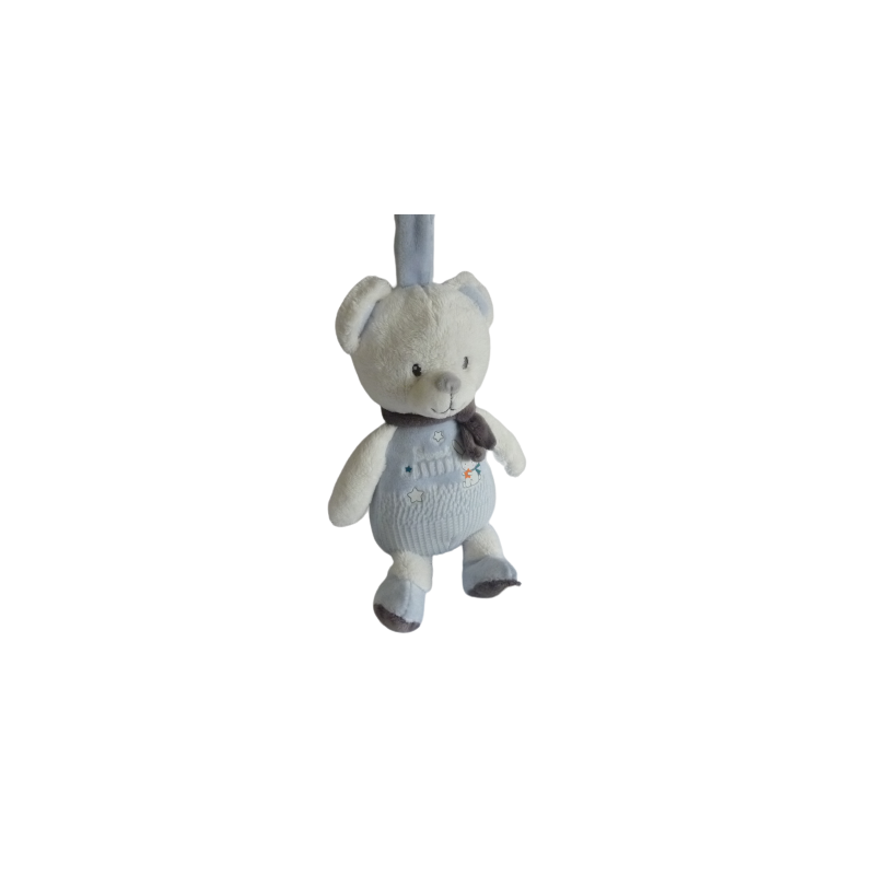 Doudou peluche ours musical 27 cm environ, bleu blanc motifs. Etat : Comme neuf (attache par velcro ne tient pas beaucoup, d'origine). DOUDOU DIFFICILE A TROUVER