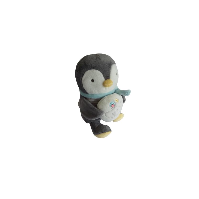 Doudou peluche musicale pingouin 22 cm environ, gris blanc, motifs oiseau étoiles. Etat : Comme neufDestinataire :