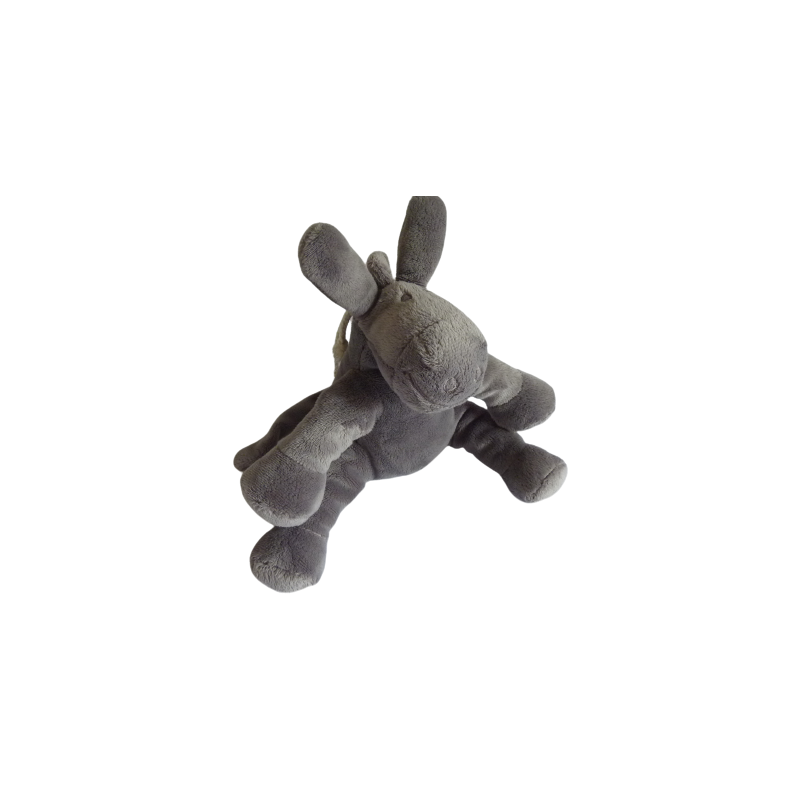 Doudou peluche musicale âne 22 cm environ oreilles comprises et en position assise, gris. Etat : Comme neuf