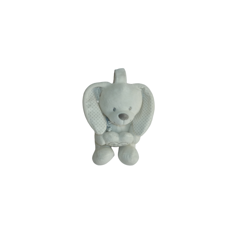 Doudou peluche musicale lapin 26 cm environ sans les oreilles, blanc, écharpe rayée, motif pois intérieur des oreilles, tient un petit cœur Mon Petit Cœur. Etat : Très bon état (la musique fonctionne mais la tirette ne se remet pas complètement au bout)