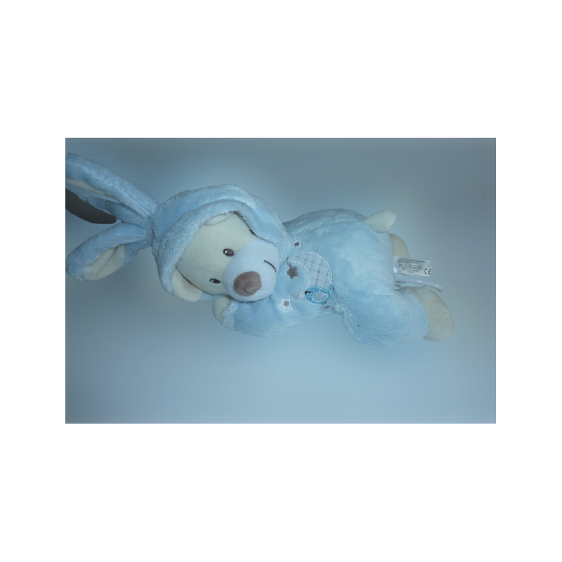 Doudou peluche musicale ours déguisé en lapin 33 cm environ de longueur, bleu écru Etat : Comme neuf