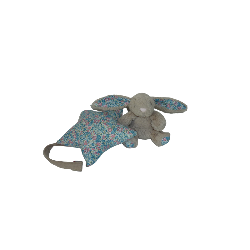 Doudou peluche lapin 12 cm environ sans compter les oreilles, étoile musicale, marron tissu fleuri. Etat : Comme neuf