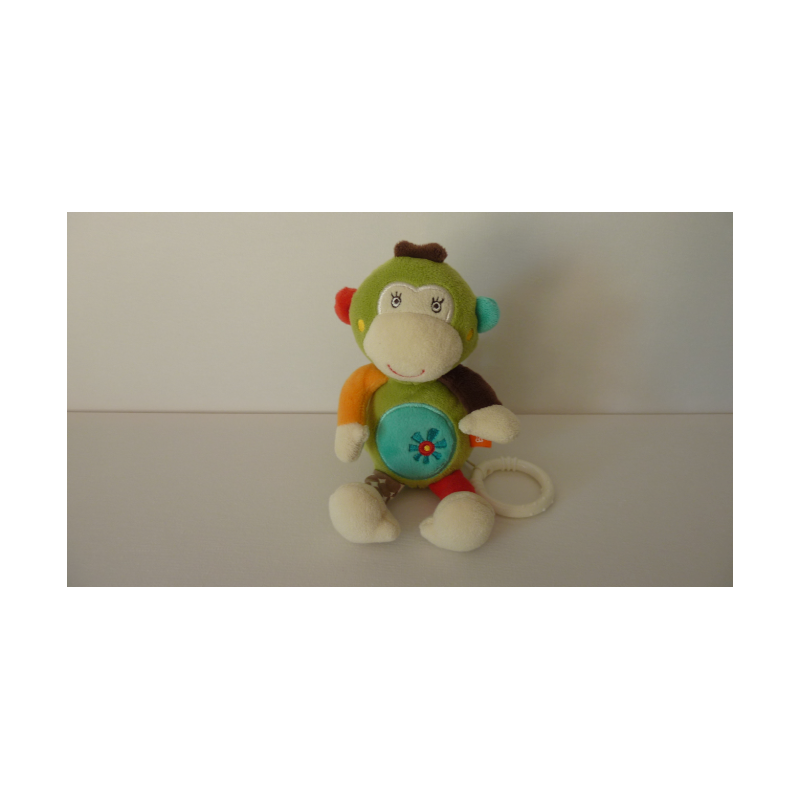 Doudou peluche musicale singe 20 cm environ, vert turquoise motifs. Etat : Comme neuf