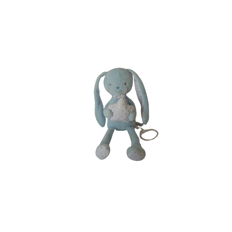 Doudou peluche musicale lapin 30 cm environ sans compter les oreilles, bleu ciel blanc motif étoiles. Etat : Comme neuf encore l'attache étiquette boutique , la musique vers la fin est un peu ralentie je trouve mais c'est d'origine
