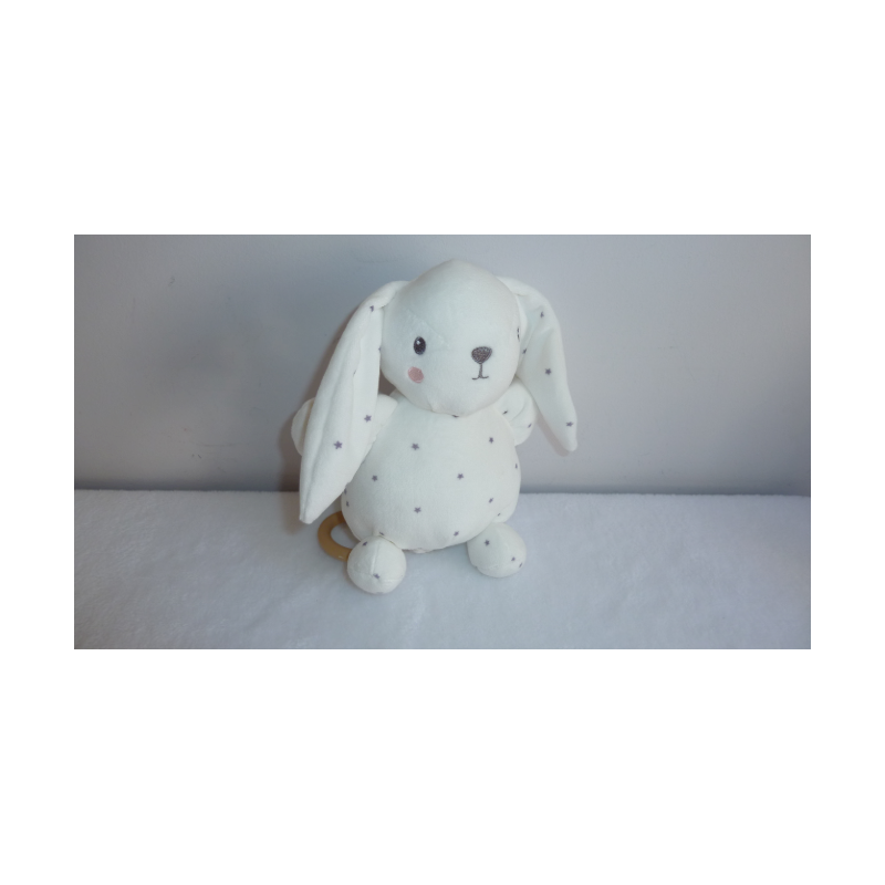 Doudou peluche musicale lapin 21 cm environ sans compter les oreilles, blanc motif étoiles. Etat : Comme neuf (étiquette marque coupée)Destinataire :