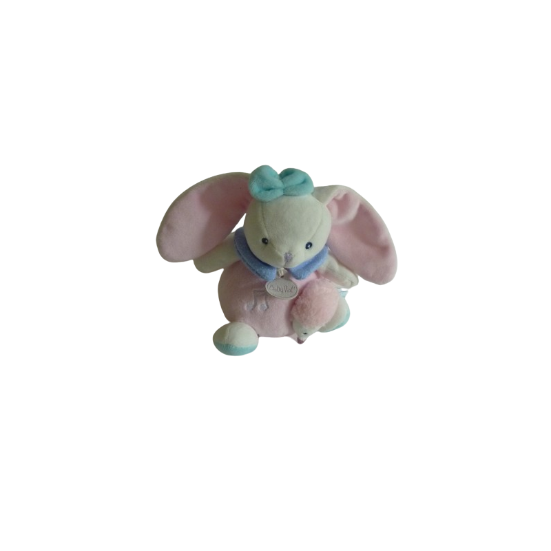 Doudou peluche musicale lapin 17 cm environ sans compter les oreilles, on tire sur le petit hérisson pour actionner la musique rose. Etat : Comme neufDestinataire :