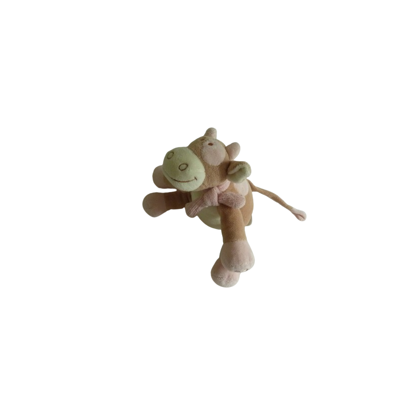 Doudou peluche musicale vache 24 cm environ, crème rose marron. Etat : La peluche est en parfait état mais la musique fonctionne un peu au ralenti mais rien de méchant.Destinataire :