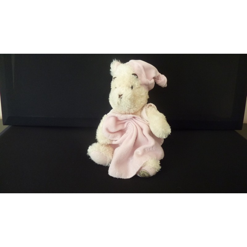 Description du doudou : doudou peluche ours de 33 cm environ (jambes tendues et sans le bonnet), mouchoir polaire avec It's a girl brodé, écusson Disney Store sous une patte, billes au popotin et les pattes. Doudou super doux. Etat : Très bon état (mouchoir polaire un peu bouloché), produit original.