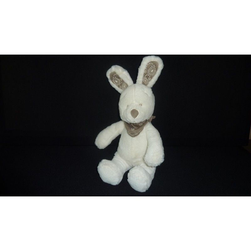 Description du doudou : Doudou peluche lapin de 30 cm environ (jambes tendues, sans les oreilles), écharpe et intérieur des oreilles en imitation daim. Doudou super doux. Etat : Neuf sans étiquette boutique, produit original.