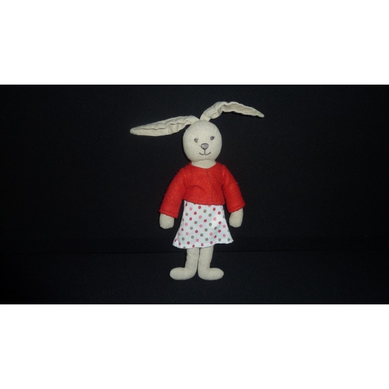 Description du doudou : Doudou peluche lapin de 25 cm environ (sans les oreilles), porte une robe à pois et veste rouge. Doudou super doux. Etat : Comme neuf (bouloches sur la veste). Produit original.Destinataire :