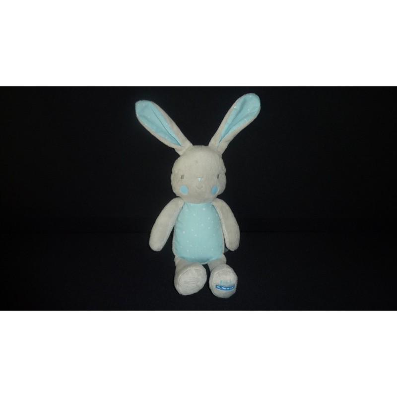 Description du doudou : Doudou peluche lapin de 25 cm environ (sans les oreilles). Coloris : gris, bleu imprimé étoiles. Doudou super doux. Etat : Neuf sans étiquette boutique. Produit original.