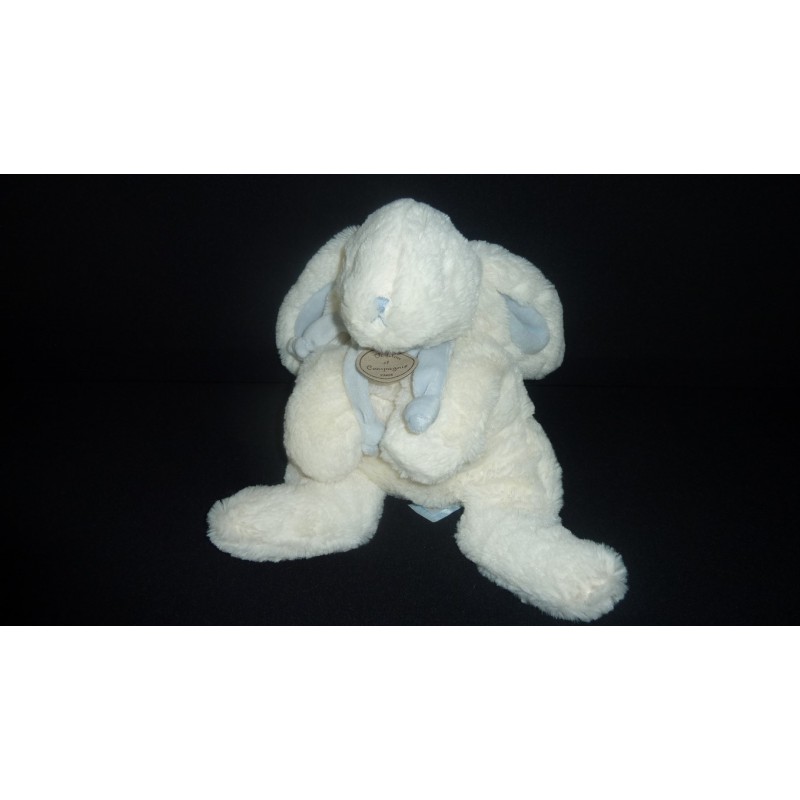 description du doudou : Doudou peluche lapin de 34 cm environ (sans les oreilles), billes au popotin et dans les pattes. Coloris : crème, écharpe et intérieur des oreilles : bleu. Doudou super doux. Etat : Neuf sans étiquette boutique, produit original.Destinataire :