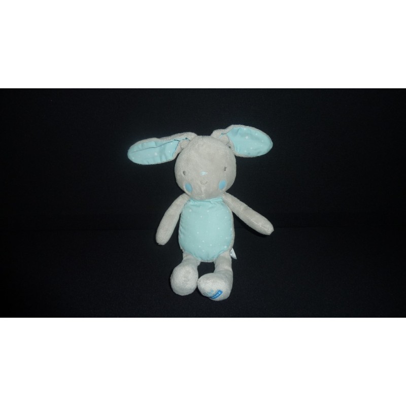 Description du doudou : Doudou peluche lapin de 27 cm environ (sans les oreilles). Coloris : gris, bleu turquoise tissu étoilé. Doudou super doux. Etat : Très bon état, produit original.Destinataire :