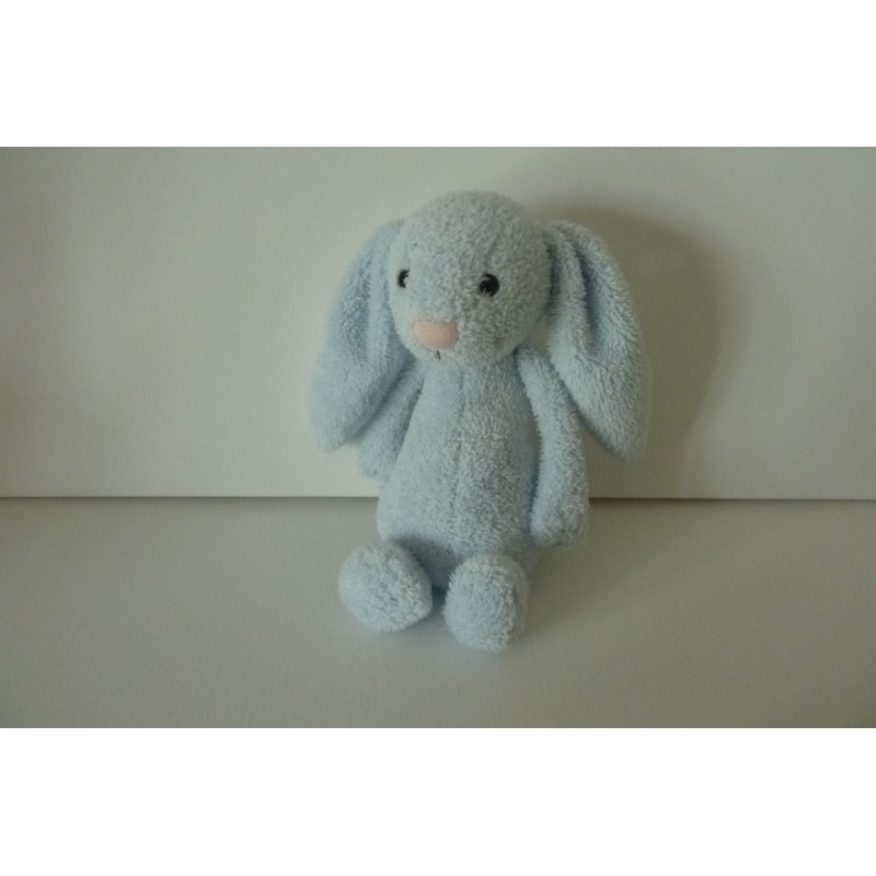 Description du doudou : Doudou peluche lapin de 31 cm environ, grelot, coloris : bleu ciel, billes au popotin et aux pattes. Doudou super doux. Etat : Très bon état, mais grelot fonctionne moins bien, produit original