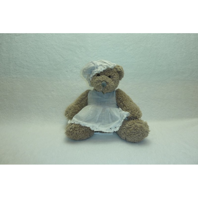 Description du doudou : Doudou peluche ours de 24 cm environ (pattes tendues), porte une robe et bonnet blanc, billes au popotin et pattes. Doudou super doux. Etat : Comme neuf. Produit original. DOUDOU DIFFICILE A TROUVERDestinataire :