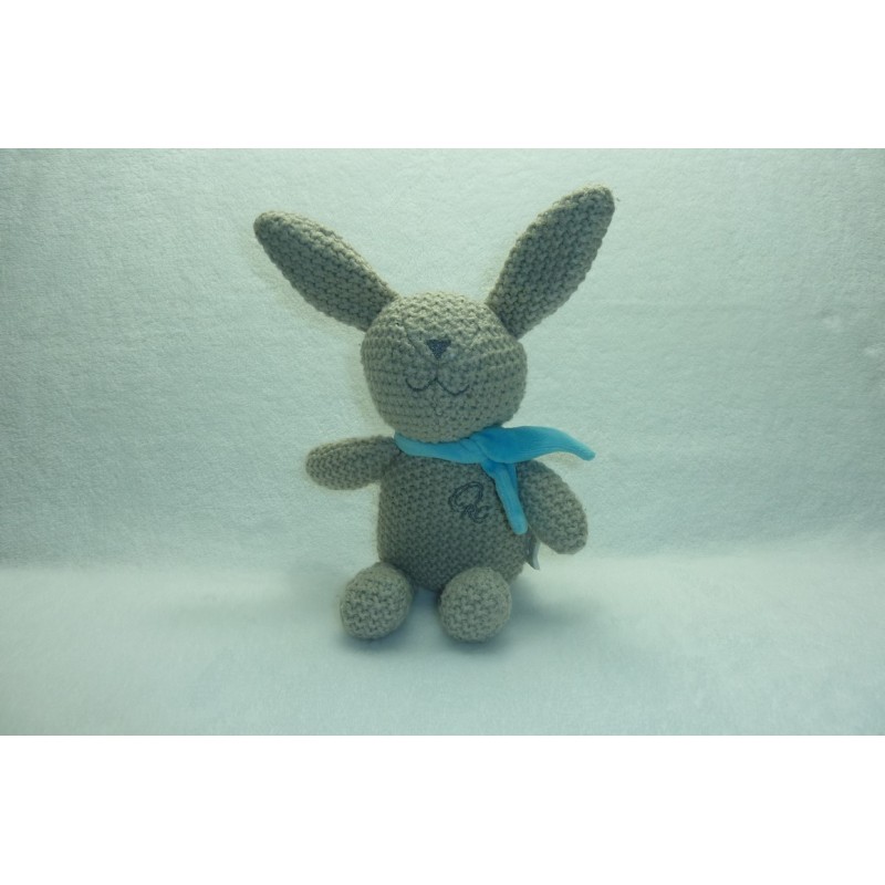 Description du doudou : Doudou peluche lapin de 31 cm environ oreilles comprises. Coloris : gris, écharpe turquoise, matière laine. Doudou super doux. Etat : Comme neuf. Produit original. DOUDOU DIFFICILE A TROUVER