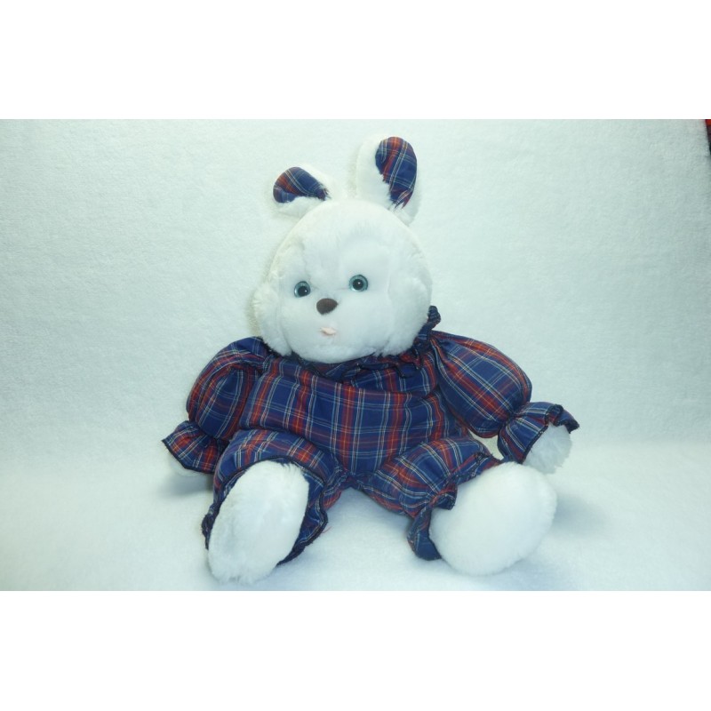 Description du doudou : Doudou peluche lapin de 37 cm environ sans les oreilles, grelot. Coloris : tissu quadrillé bleu rouge jaune. Etat : Comme neuf. Produit original. DOUDOU DIFFICILE A TROUVER