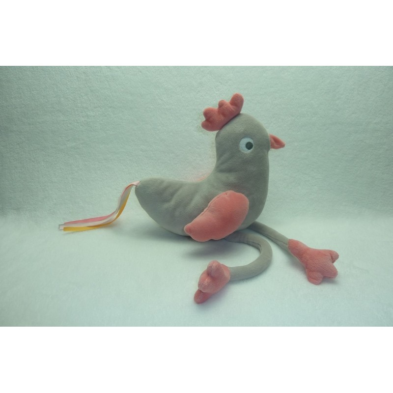 Description du doudou : Doudou peluche poule de 42 cm environ. Coloris principal : gris, rose. Etat : Comme neuf (étiquette de la marque coupée). Produit original. DOUDOU DIFFICILE A TROUVER