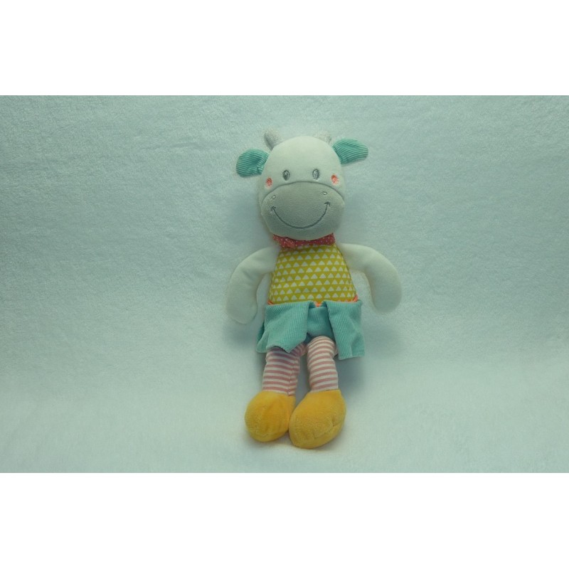 Description du doudou : Doudou peluche vache de 33 cm environ. Coloris : turquoise, jaune, blanc, rayures, porte une jupe velours turquoise. Etat : Neuf sans étiquette boutique mini trou sur un bras dû l'attache étiquette boutique). Produit original. DOUDOU DIFFICILE A TROUVER