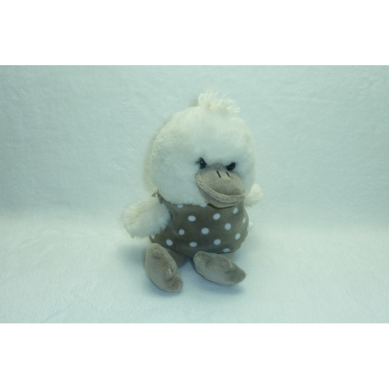 Description du doudou : Doudou peluche canard de 28 cm environ de longueur. Coloris : blanc, taupe, tshirt taupe à pois blanc. Etat : Neuf sans étiquette boutique. Produit original. DOUDOU DIFFICILE A TROUVERDestinataire :