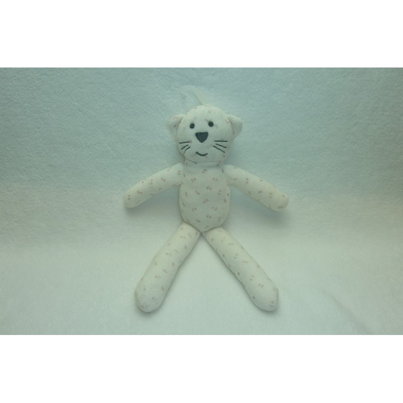 Description du doudou : Doudou peluche chat de 29 cm environ. Coloris : blanc imprimé petites fleurs. Etat : Comme neuf (étiquette de la marque coupée, encore l'attache étiquette boutique). Produit original. DOUDOU DIFFICILE A TROUVER