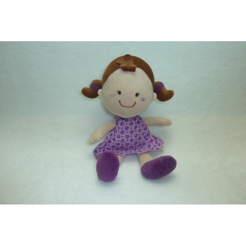 Description du doudou : Doudou peluche poupée de 26 cm environ, billes au popotin. Coloris : marron, beige, violet, robe violette motif coeur. Etat : Comme neuf. Produit original. DOUDOU DIFFICILE A TROUVERDestinataire :
