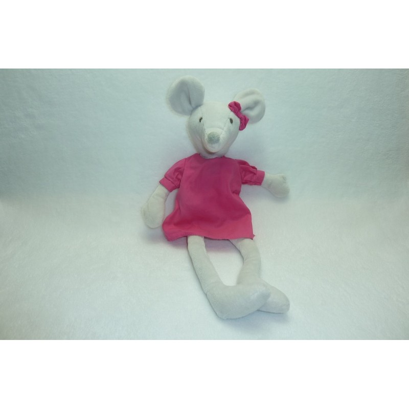 Description du doudou : Doudou peluche souris de 46 cm environ. Coloris : gris, porte une robe et un nœud nœud rose. Etat : Comme neuf. Produit original. DOUDOU DIFFICILE A TROUVERDestinataire :