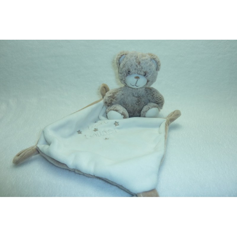 Description du doudou : Doudou peluche ours de 12 cm environ, tient un mouchoir. Coloris : marron, blanc, Mon doudou et étoiles brodés. Etat : Neuf sans étiquette boutique. DOUDOU DIFFICILE A TROUVER