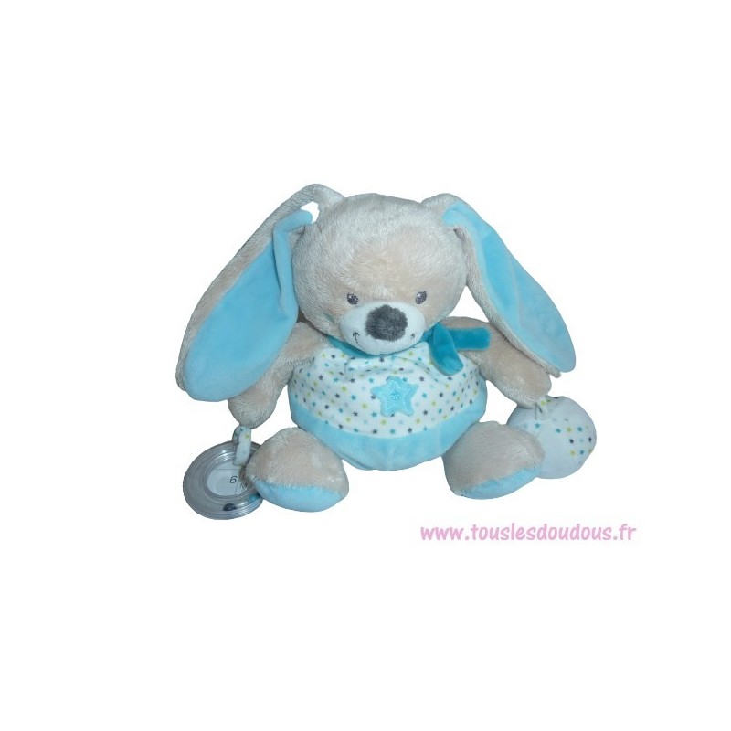 Doudou peluche lapin 26 cm environ (sans les oreilles), grelot, anneau à grelot, bleu blanc marron motif étoiles. Etat : Neuf sans étiquette boutique. SOS DOUDOU DIFFICILE A TROUVER.