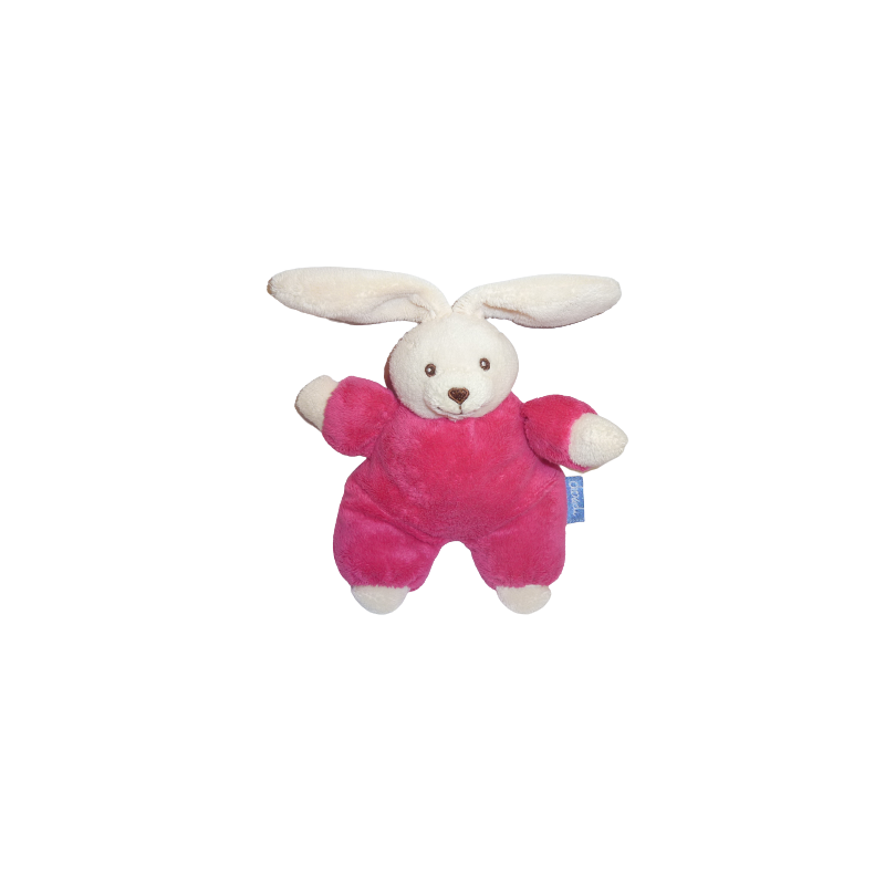 Doudou peluche lapin 19 cm environ sans les oreilles, grelot, fushia. Etat : Comme neuf. DOUDOU DIFFICILE A TROUVER.