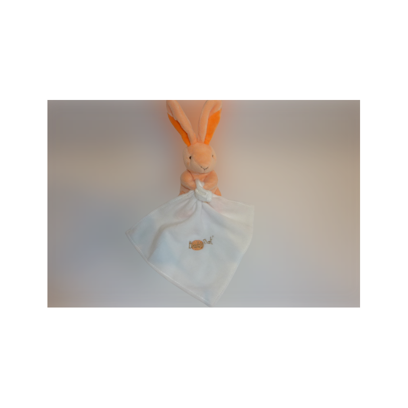 Doudou peluche lapin 18 cm environ oreilles comprises, saumon, mouchoir blanc. Etat : Comme neuf. DOUDOU DIFFICILE A TROUVER.Destinataire :