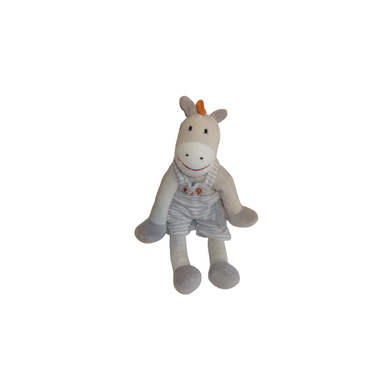 Doudou peluche cheval 33 cm environ, grelot, gris salopette à rayures. Etat : Comme neuf. DOUDOU DIFFICILE A TROUVER.Destinataire :