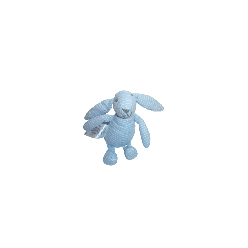 Doudou peluche lapin 13 cm environ (mesure jambes tendues et sans compter les oreilles), rauyres bleu blanc. Etat : Neuf sans étiquette boutique. DOUDOU DIFFICILE A TROUVER.Destinataire :