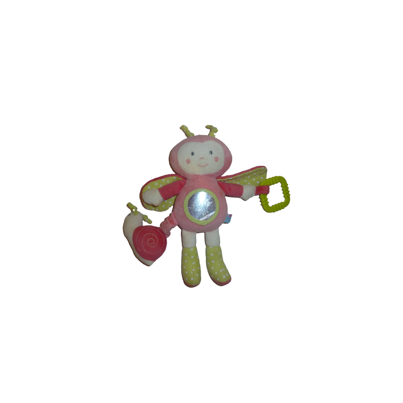Doudou peluche papillon 27 cm environ, grelot, miroir, anneau dentition , matière bruissante, escargot pouet pouet, rose vert petits pois. Etat : Peluche en très bon état (mais taches sur l'escargot et miroir griffé). DOUDOU DIFFICILE A TROUVER.