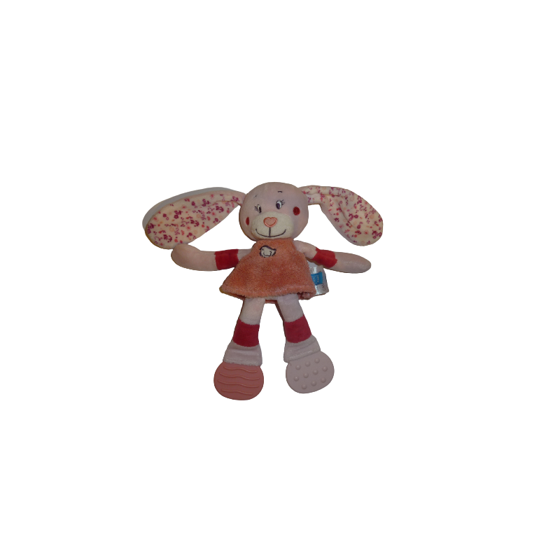 Doudou peluche lapin 24 cm environ sans compter les oreilles, grelot, 2 anneaux de dentition, matière bruissante. Etat : Excellent état. DOUDOU DIFFICILE A TROUVER.