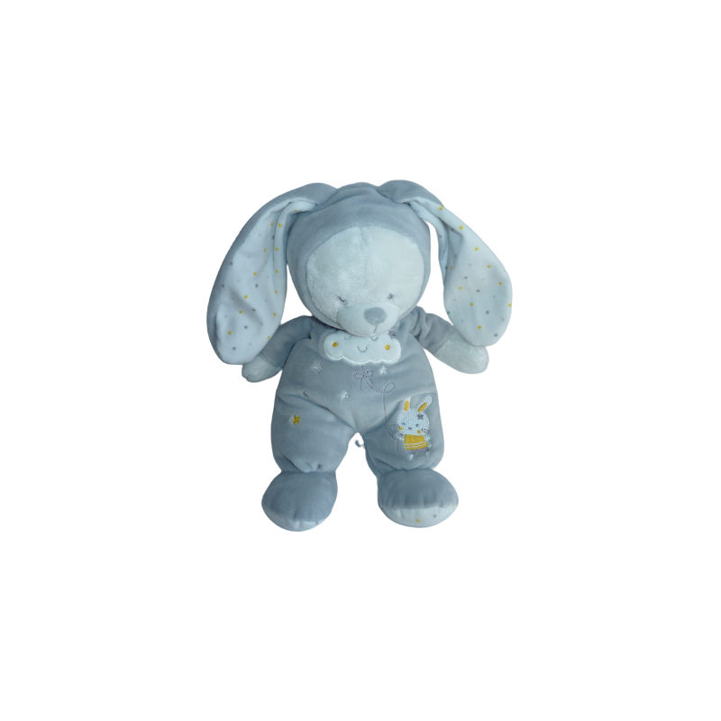 Doudou peluche ours déguisé en lapin 29 cm environ sans les oreilles, gris blanc motifs : nuage étoiles lapin. Etat : Neuf sans étiquette boutique. DOUDOU DIFFICILE A TROUVER.
