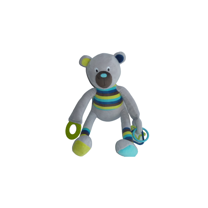 Doudou peluche ours éveil 39 cm environ, anneaux dentition, matière bruissante, gris rayures multicolores. Etat : Neuf sans étiquette boutique. DOUDOU DIFFICILE A TROUVER.Destinataire :